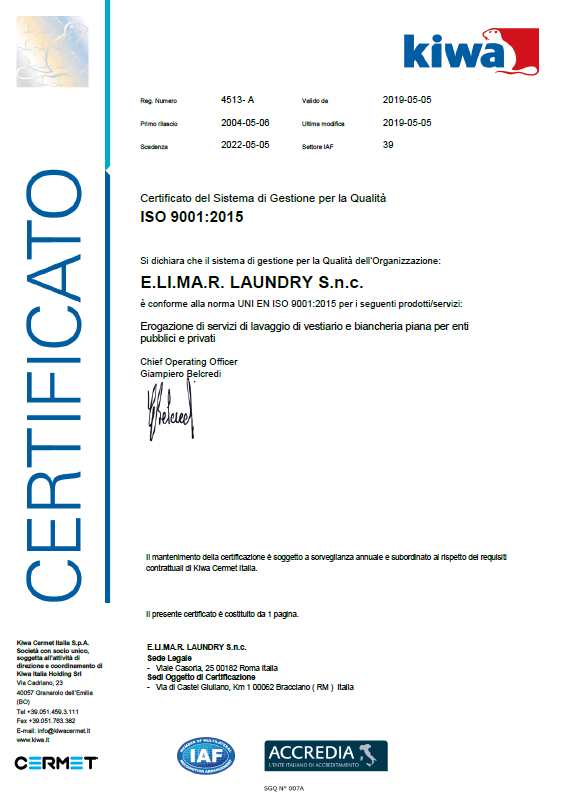 Ricordate: scegliendo Elimar Laundry vi assicurate un sistema di gestione qualità certificato secondo la norma UNI-EN ISO 9001-2008.